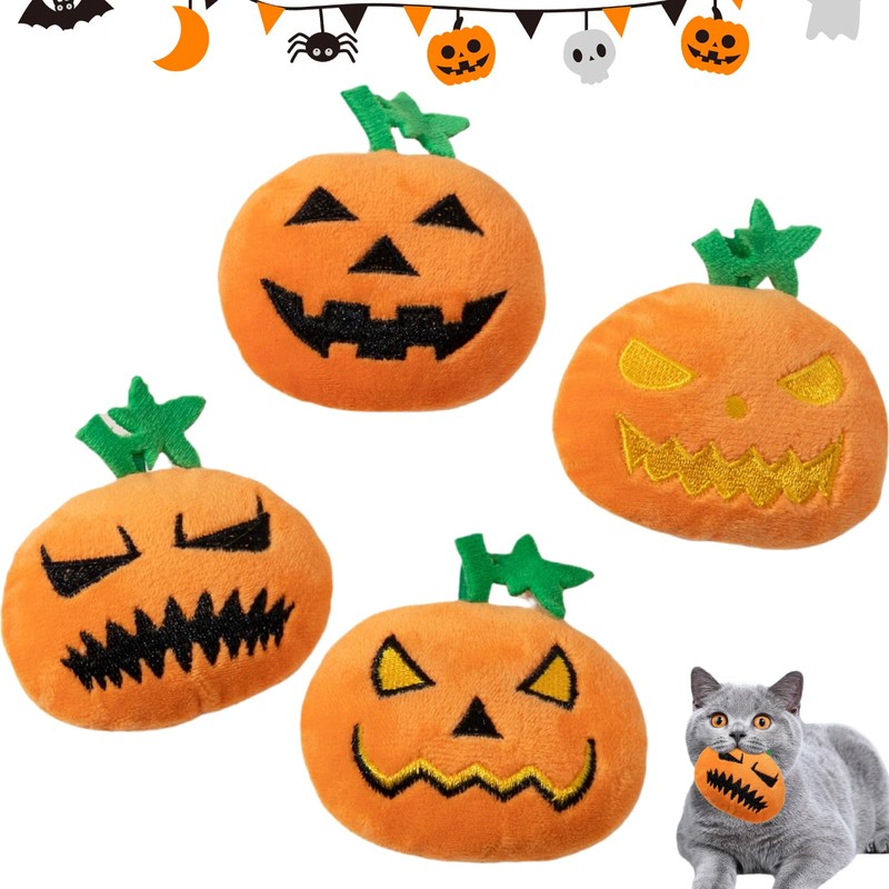 Ksheria 4Pcs Pumpkin-Shaped Cat Toys with Crinkly Sound, Horror Teething Chew Toys for Indoor Kitten Exercise – All Breeds