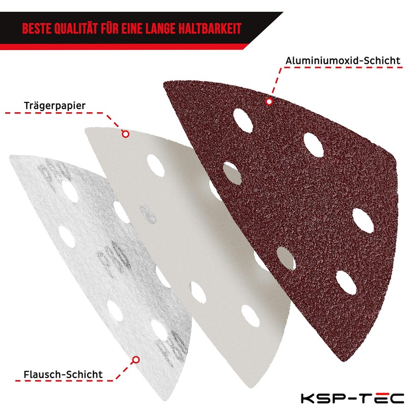 - Universally applicable: The KSP-Tec Delta sandpaper is equipped with high-quality corundum and therefore very universally applicable. Ideal for woods, metals, plastics, paints and varnishes.