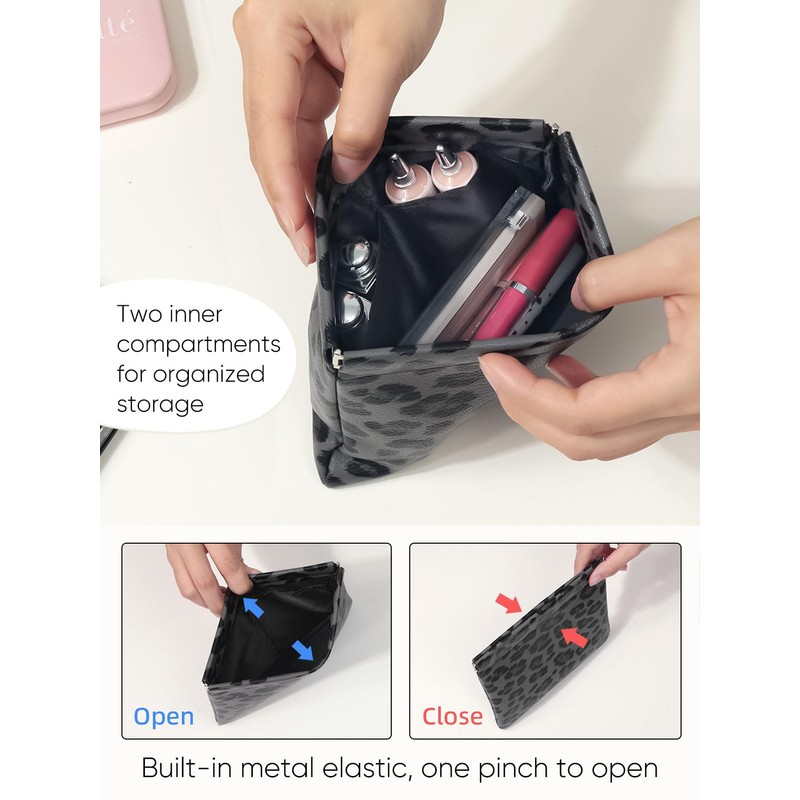 Ksriylm Leopard Leather Small Makeup Pouch for Women,Cosmetic Accessories Organizer,Waterproof and Portable Cosmetic Bag,Self-closing, No Zipper, Aesthetic Storage Pouch,Lipstick for Purse,Grey