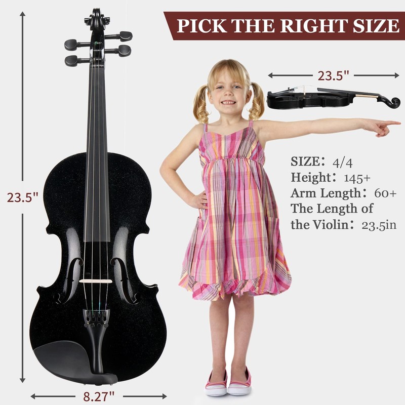 - FULL EQUIPMENT: The full-size violin set includes a violin, portable case, bow, bridge, polishing cloth, extra set violin string, mute, shoulder rest, rosin and finger guide sticker- no need to wait or look for additional violin accessories!