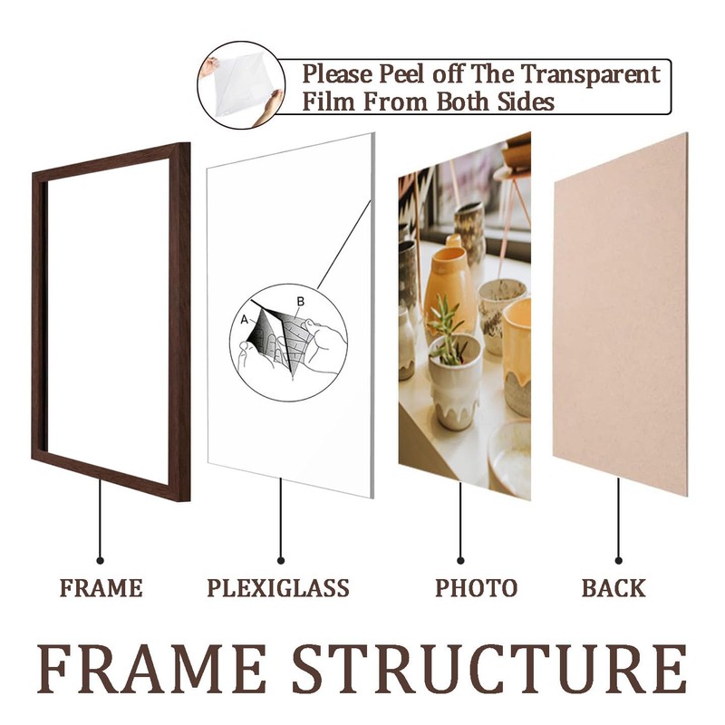 - Versatile A4 Frame Design: These sleek Walnut frames perfectly showcase 8.3 x 11.7 inch (A4 size) photos, artwork, or documents with a clear, shatter-resistant glass(Note: Please peel off the protective films on both side of plexiglass) front and sturdy backboard.Wood Composite Material .