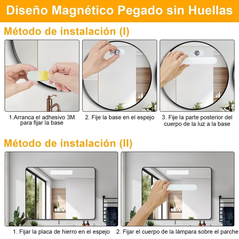 - Base magnética --- Nuestra Luces de espejo inalámbrica adopta el diseño de luz y base desmontables, que es conveniente para el uso móvil y la carga en cualquier momento, para que su espacio no esté desordenado.