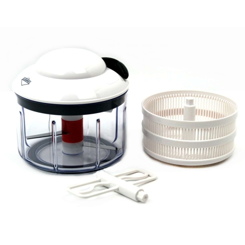 - Consists of a drive unit, a cutting rotor, a booster arm, a container with lid, a spinning basket and a mixing arm.