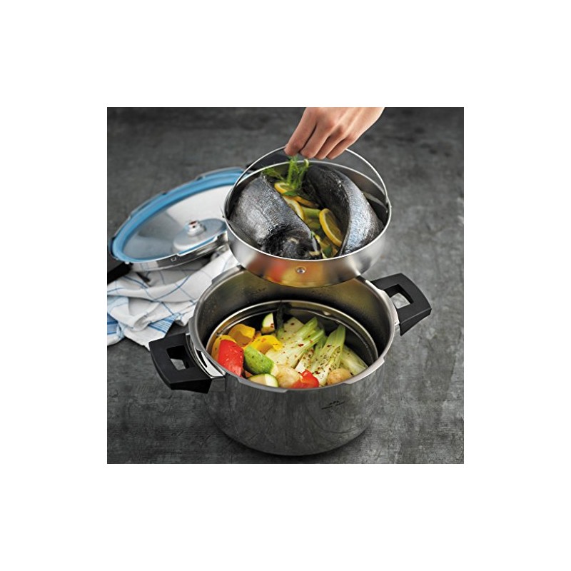 - Flexible steamer insert for gentle steaming. Suitable for all cooking pots with a diameter of 14 cm and 22 cm.