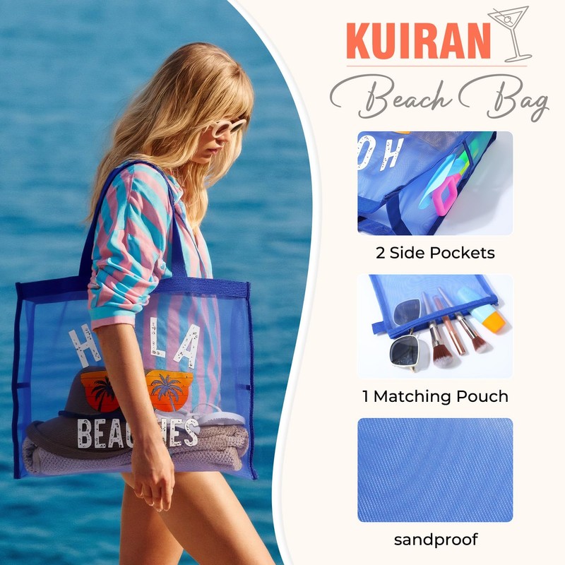 KUIRAN 30L Large Beach Bag with Pouch Foldable Sandproof Lightweight Mesh Tot...