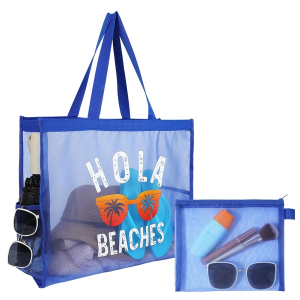• 30L Large Mesh Beach Bag with Special "Hola Beaches" Print – Spacious beach tote bag featuring a vibrant "Hola Beaches" graphic. This large mesh beach bag provides ample room for carrying beach towels, sunscreen, and snacks on your next beach trip. Dimensions: 18.9"(L) x 6.5"(W) x 15.7"(H)