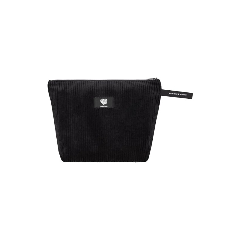 Das Außenmaterial aus schwarzem Cord ist formstabil, weich im Griff und klassisch im Look – ideal für unterwegs, im Rucksack, Koffer oder Bad. Die seitliche Schlaufe mit dem „Made with Love in Berlin“-Label macht das Aufhängen ganz einfach – im Hotel, auf Reisen oder im Camper.