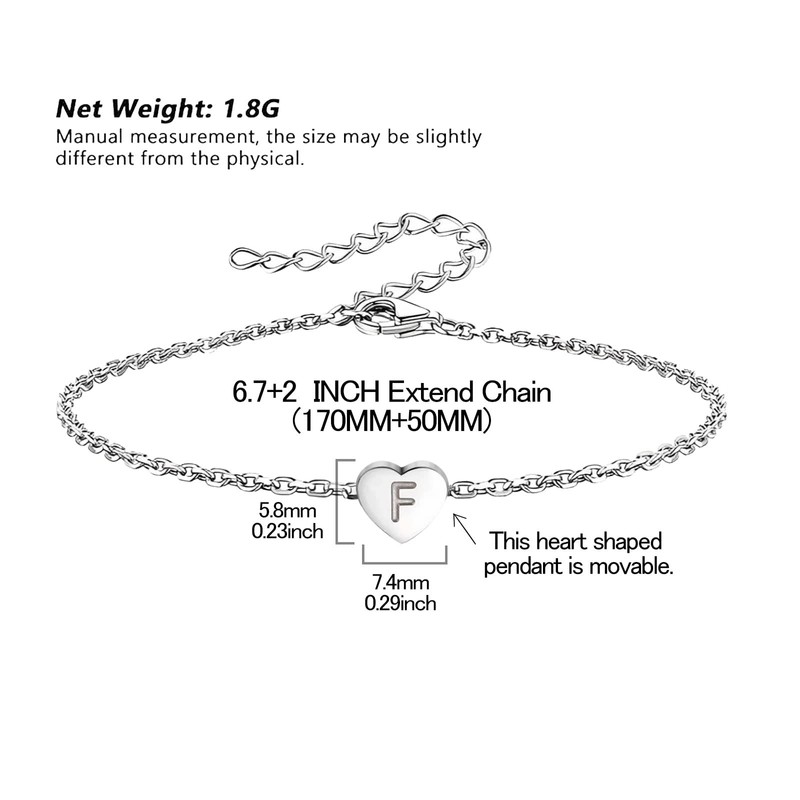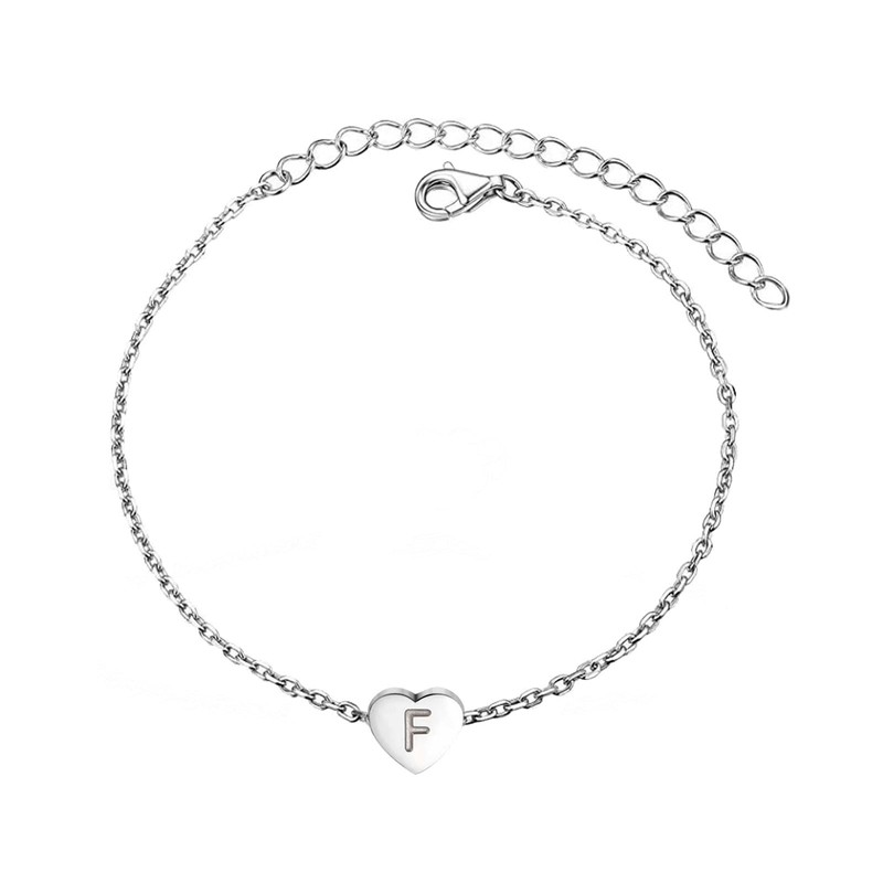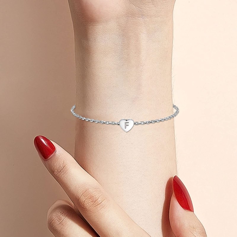 KunBead Jewelry Silver Initial F Letter Bracelet Love Heart Charm Stainless Steel Birthday Jewellery Gift Bracelets for Women