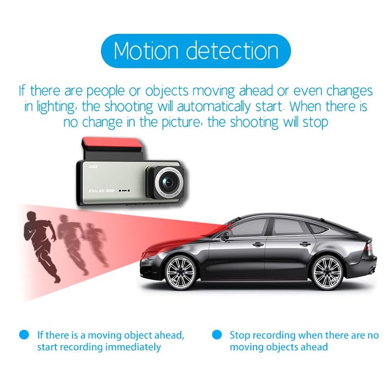 - 【Motion Detection Function and Collision Induction】Recording will start automatically if someone or an object moves in front of you, or even if the light changes. Shooting will stop when there is no change in the picture. When a collision occurs, the sensor immediately senses and records the entire accident, and locks and saves the video clip
