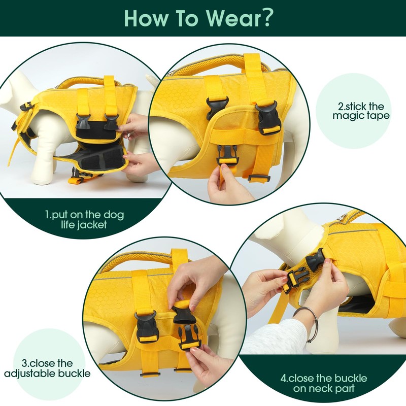 - 【Adjustable Dog life Preserver】dog life preserver belly and neck are designed with sturdy adjustable nylon straps and double-row quick-release buckles with magic sticker panels to provide double security for your dog. These designs are easy to put on and take off