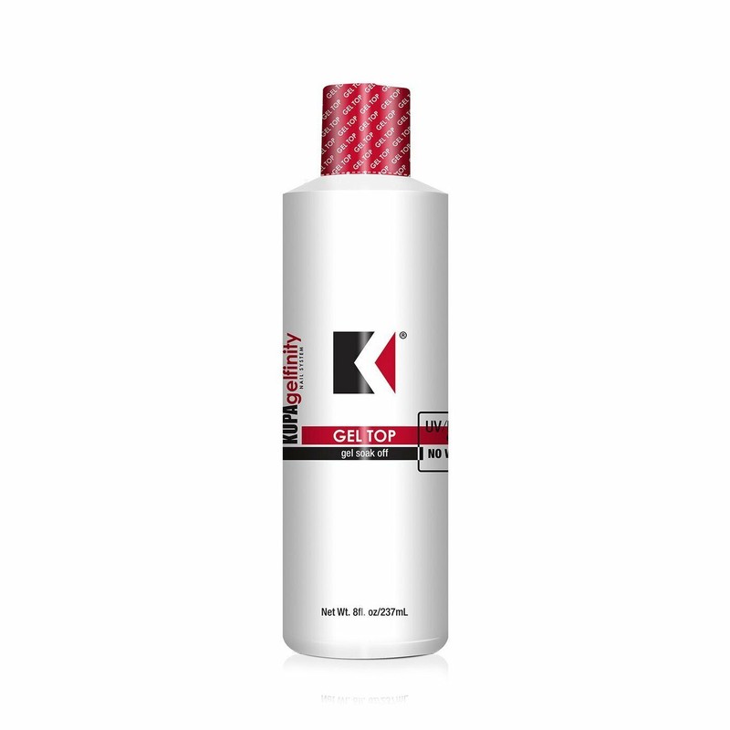 GelFinity Gel Top Seals Soak-Off gel polish to a high gloss shine that will not fade, chip or peel. Cures to a no-wipe finish. To remove soak-off with acetone or polish remover. Cures 90 seconds in your KUPA  Light or 2 minutes in a standard UV Light.