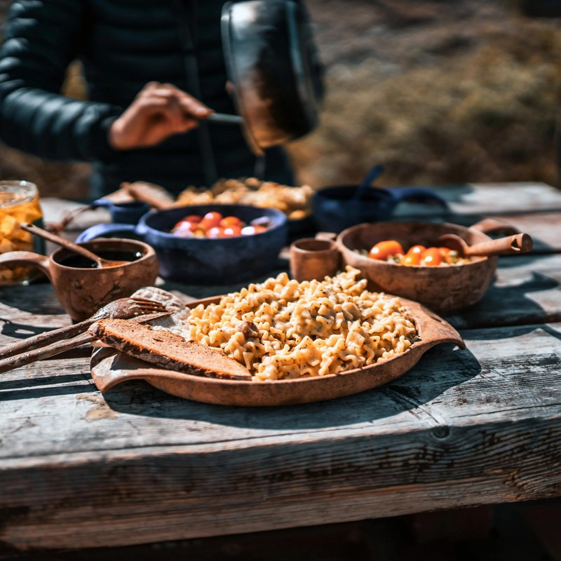 - Das Set „FILL THAT BELLY“ enthält Teller und Besteck für zwei Personen. Genießen Sie ein Stück Natur am Esstisch im Haus oder genießen Sie es bequem draußen am Kaminfeuer. Die beiden Griffe sorgen dafür, dass der Teller beim Essen sicher auf Ihrem Schoß sitzt. Der Teller dient auch als Serviertablett für Kaffeeservice oder Suppenschüssel.