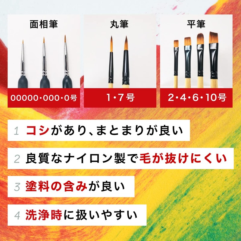- ☑ Moderate resilient bristles create a superior touch of drawing. The material is nylon with low deterioration and shedding (animal is easy to lose hair by solvents). The balance of water absorption and drainage is also good, so you can paint it without any trace and brush cleanup quickly