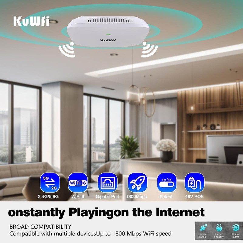 • 【What is KuWFi AX820】wifi access point is an 11ax Wi-Fi standard MTK Chipset of high industrial power wireless access point, access point with ethernet supports MU-MIMO, Wave2.0, OFDMA and Seamless Roaming, publicly to be used in high access density environments such as university campus, concert hall, gym, etc MT7905N MT7975DN. Large capacity to connect up to more than 150 devices at the same time. wifi access point with ethernet