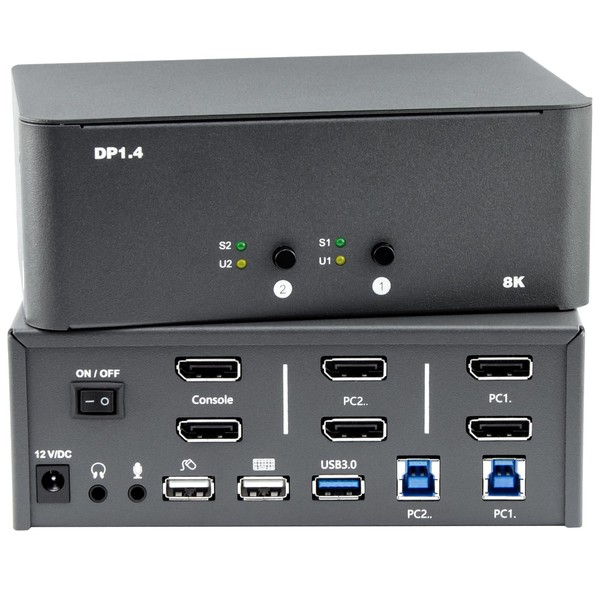 The product is 2 Ports 8K multi Monitor DisplayPort 1.4 KVM Switch,allows users to control two 8K DisplayPort computers with one set of keyboard, mouse,and multi DisplayPort monitors. This DisplayPort 1.4 KVM Switch supports resolutions of 8K 60Hz (4:4:4) (DSC),5K 120Hz, 4K 144 Hz, or 4K 120Hz, compliant with HDCP specifications, and supports EDID pass-through, to 16:9, 21:9, or 32:9 monitors.It can satisfy every user to complete his projects, enjoy home entertainment, or playing video games with vivid visuals, accurate color, and sharp details. Features an auxiliary 3.5mm audio and MIC port and USB 3.2 Gen 1 hub,offereds 10 Gbps data transmission speed.This 8K KVM Switch offers a total bandwidth of up to 32.4 Gbps for video and data transmission.