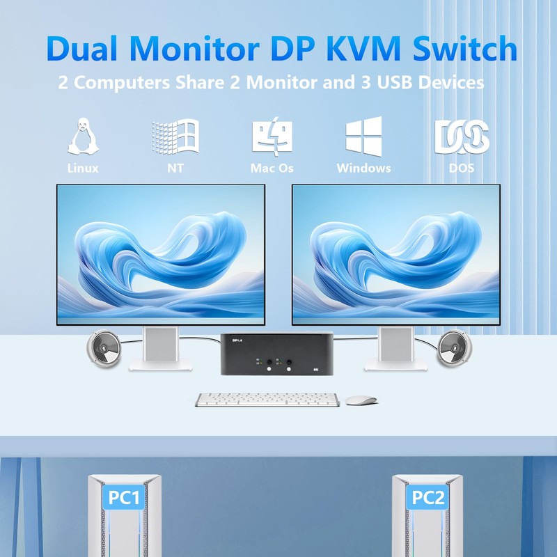 KVM Switch 2 Monitors 2 Computers, 8k Displayport Switch with USB 3.0, Jack, 2 Computers Share a Set of Keyboard, Mouse, Support Windows/Mac/Linux (Dual Monitor)