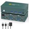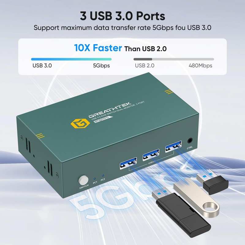 - 【USB3.0 KVM Switch】This KVM switch 2 monitors 2 computers with 3 USB 3.0 ports,can provide up to 5Gbps transfer rates, which is 10 times the transfer rate of USB 2.0. When you share devices such as printers, cameras, scanners, or USB flash drives between two computers, the data reading speed will be significantly faster and greatly enhancing your work efficiency