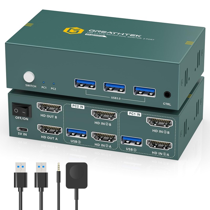 KVM Switch 2 Monitors 2 Computers HDMI 8K@60Hz, USB3.0 4K@144Hz Dual Monitor KVM Switch with 3 USB 3.0 Ports Sharing Keyboard and Mouse Printer Scanner, KVM Switches with Desktop Controller