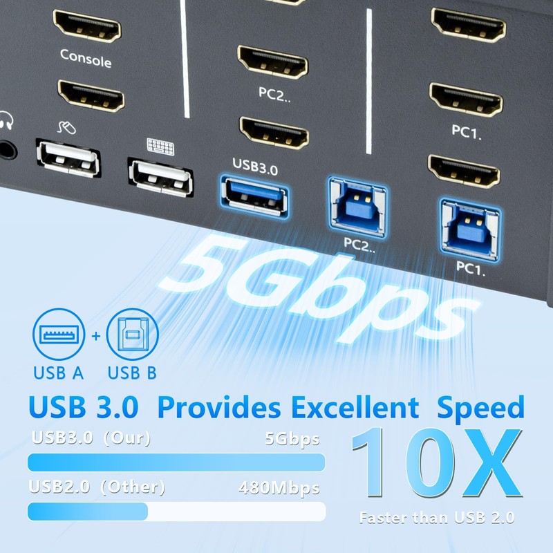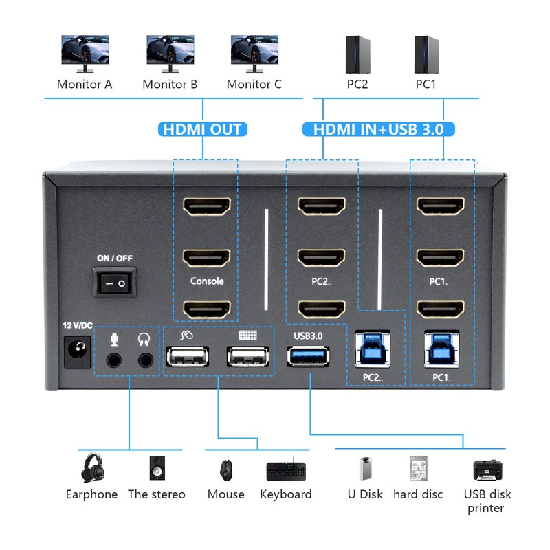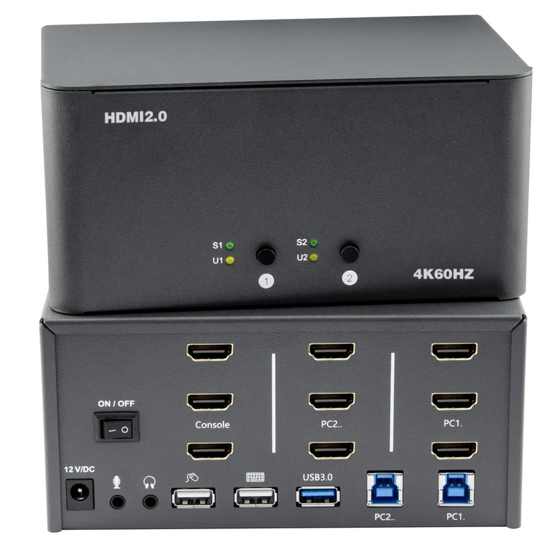 - Double Computer Connectivity: Connect and switch between 2 computers or laptops, sharing one set of keyboard, mouse, four monitors, audio, and microphone.