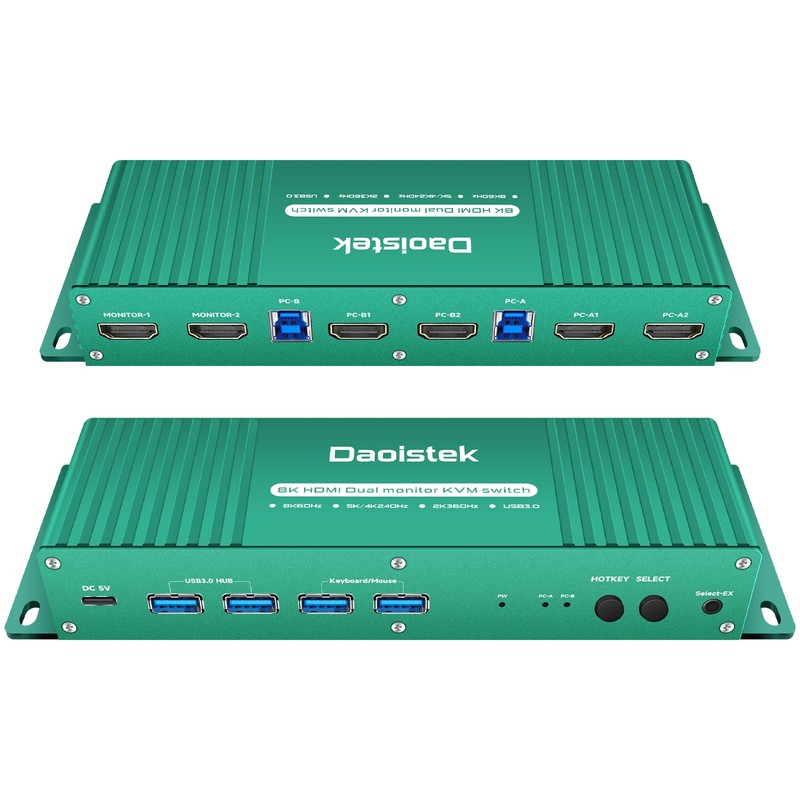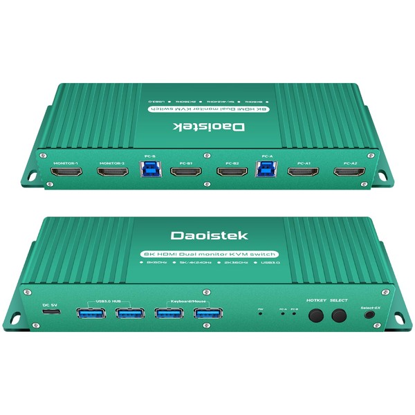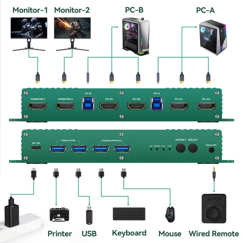 It is HDMI2.1 2 Port KVM HDMI2.1 2 in 2 out. The KVM Switch 2 Computers 2 Monitor HDMI sharing one set of keyboard & mouse, 1 HDMI2.1 monitor, and 2 pcs USB 3.0 peripheral devices. 2 pcs USB 3.0 hub (data transferring rate up to 5Gbps/s ,10 times faster than USB 2.0), 2 kits cables and a wire remote push button switch.The HDMI KVM Switch is Recommend resolution 5120x1440@60Hz, 5120x1440@75Hz,5120x1440@120Hz,5120x1440@144Hz,5120x1440@165Hz,3440x1440@75Hz,3440x1440@100Hz,3440x1440@144Hz,3440x1440@165Hz,3440x1440@175Hz,7680x4320@60Hz ,3840*2160@60Hz,3840x2160@144hz,3840x2160@175hz,3840x2160@240Hz ,2560*1440@165Hz,2560*1440@144Hz,3840x1600@144Hz,3840x1600@165Hz,3840*1620@144Hz,3440*1600@144Hz,3840*1080@240Hz,and so on. The KVM HDMI 2 PC 2 monitor Switch for 2 Computers Dual Monitor,manual button switching, wired remote push button switching.The KVM switch HDMI 2 Port: Support long HDMI2.1 Cables, The kvm switch HDMI has auto EQ,Support long HDMI2.1 Cables 4k 144Hz 2K165Hz 1440P 120Hz 144Hz 165Hz 175Hz 240Hz , HDMI input 3M , HDMI Output 3M For RTX3060, RTX3070,RTX3080, RTX3090,RTX4080,Support FreeSync G-SYNC.The 2 Port Kvm Switch HDMI can support EDID clone. The HDMI Kvm Switch can support type-c to hdmi. The kvm switch can support DP TO HDMI output.It can support HDMI TO DP,too.It must use hdmi2.1 Cables,and use the accessory cable for output.the kvm switch 2 monitors 2 computers HDMI can not support hotkey switching