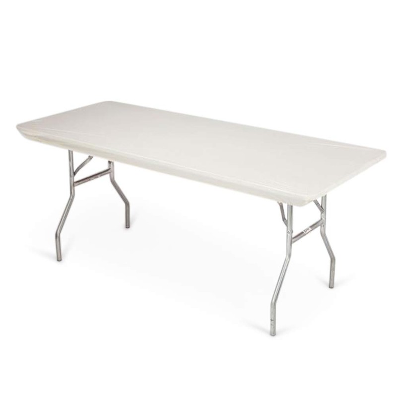 - Bundle of 5 Ivory Fitted Plastic Table Covers to fit 6' long banquet table