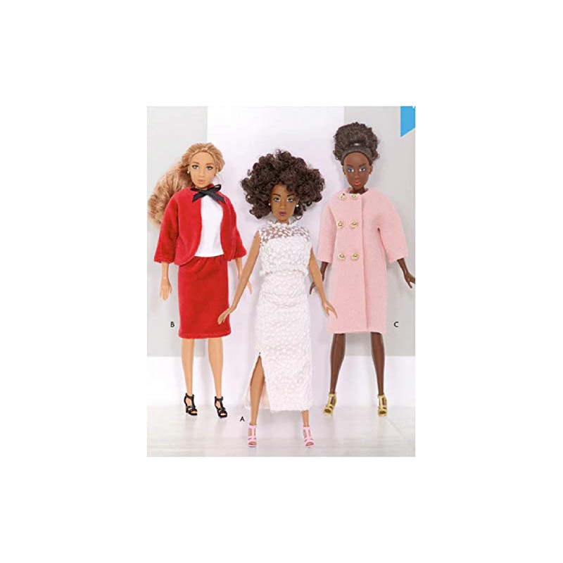 - First lady vintage style, for 11.5 inch fashion dolls. Gown A has lace overlay and beading; suit B includes elastic waist skirt and ribbon bow detail. Coat C has snap closing and button trim.