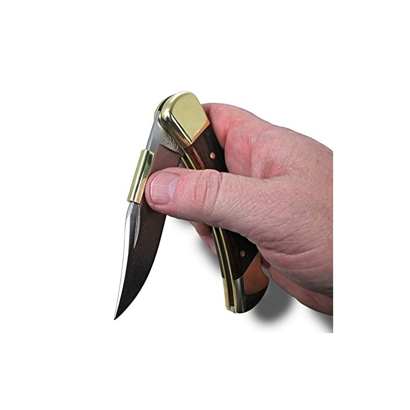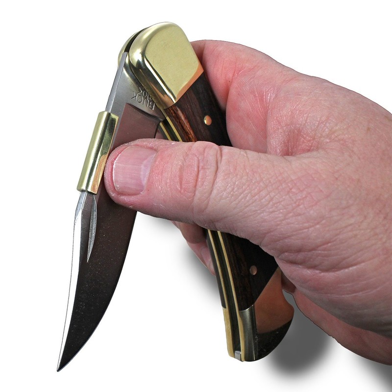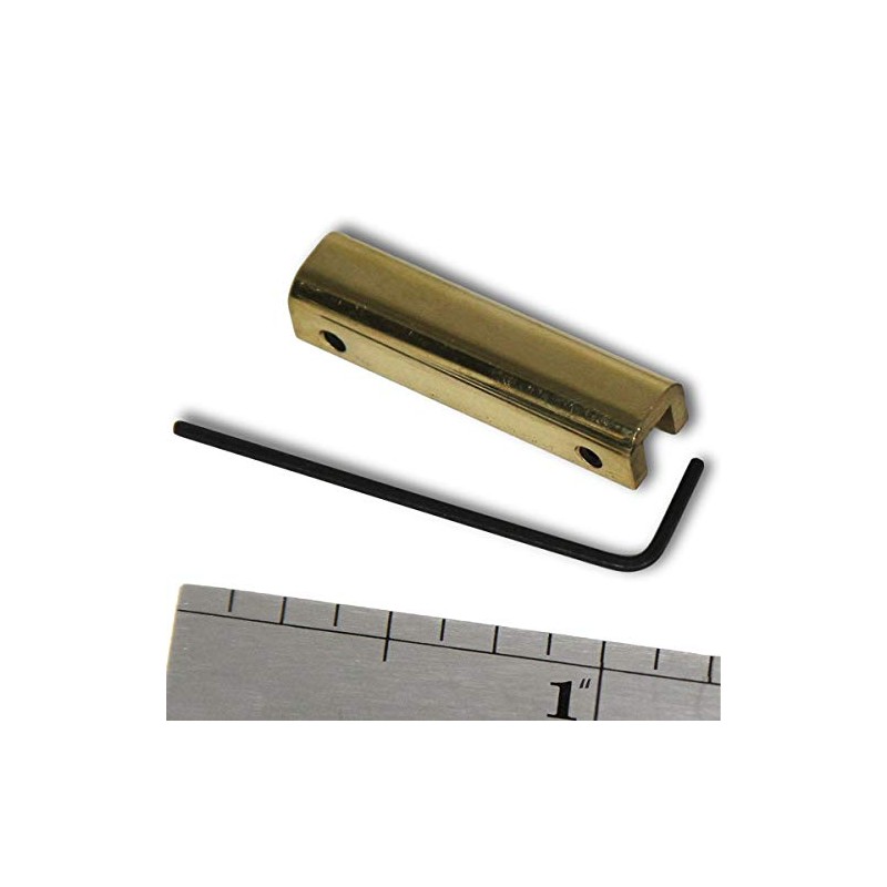 Made in USA Hand Polished Bright Brass Matches your Brass Bolsters 1"long x .25" wide x .20" tall Includes 1ea .035" hex wrench with each Kwik Thumb Bar Attachable thumb bar for your Buck 110 or other folding knives. Twin set screws hold this add-on thumb bar for your Buck 110 firmly in place. The Buk Bar allows you to open your Buck 110 or other folding knife with just one hand. The low profile says out of your way when cutting and adds a nice bit of bling. The Buck Bar has both form and function. Note: Multiple Kwik Thumb Bars are shown for clarity. You are ordering these by singles.