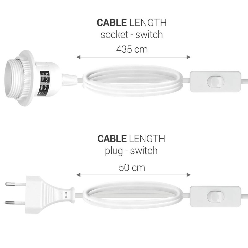 - Technical data: the bulb socket can be used for bulbs with an E27 thread. These should be max. 60 W power. The distance between plug and switch is approx. 50 cm, between switch and socket approx. 4.35m