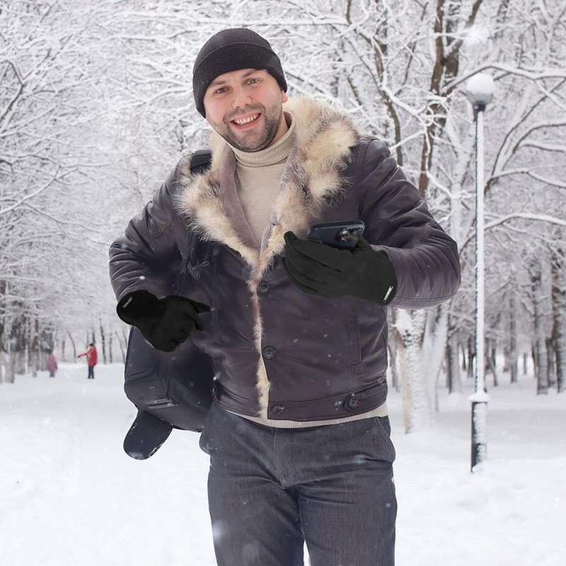 - MATERIAL: The men’s winter warm touchscreen suede gloves are made of supple suede material, which is hard wearing, breathable, wind resistant and durable. Men who don't wear gloves in winter are always prone to frostbite. So the gloves are men’s necessary accessories in winter.