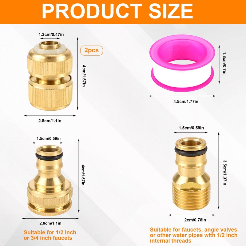- Compatibility: the two 1/2 inch quick couplings are suitable for water pipes with an inner diameter of 12 mm and an outer diameter of 16 mm. A 2-in-1 multi-function water connector is for 1/2 inch or 3/4 inch faucets, which can be seamlessly installed on 1/2 inch faucets; after unscrewing the top part, it can be perfectly installed on 3/4 inch faucets. The 1/2 inch water connection coupling is suitable for taps, angle valves or other water pipes with 1/2 inch female thread.