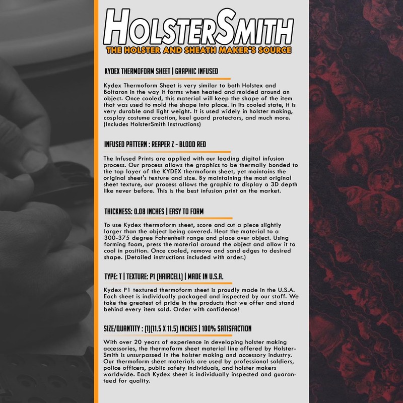 - Size/Quantity : (1)(11.5 x 11.5) Inches | 100% Satisfaction Guaranteed: With over 20 years of experience in developing holster making accessories, the thermoform sheet material line offered by HolsterSmith is unsurpassed in the holster making and accessory industry. Our thermoform sheet materials are used by professional soldiers, police officers, public safety individuals, and holster makers worldwide. Each Kydex sheet is individually inspected and guaranteed for quality.