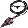 - Crystal point chain size: Full length of 29-47 cm. The circumference of the leather rope can be adjusted from 46 cm to 82 cm, 0.2 cm thick. Pendant size: Length 57-65 mm, diagonal 20 mm, hole length 5-8 mm, width 3-6 mm, beads 6 mm, total weight is approx. 15-17 grams.
