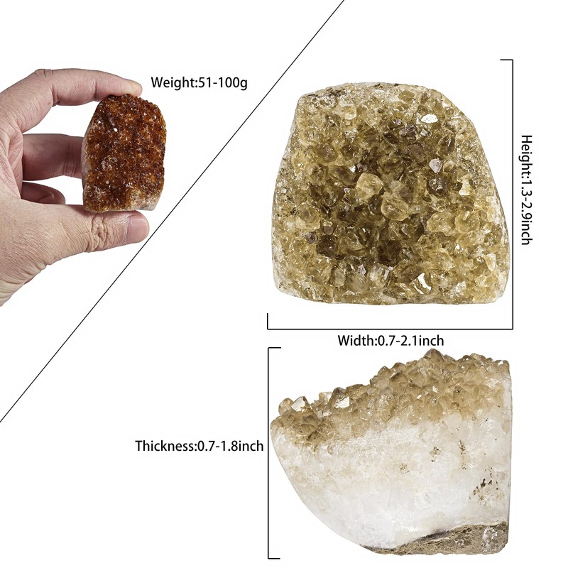 • Size of Rock Specimen: Height: 1.38-2.95" (35-75 mm); Width: 0.79-2.17" (20-55 mm); Thickness: 0.71-1.89" (18-48 mm); Weight: 51-100 g/pc. Package Includes: 1 Unpolished Citrine Crystal Cluster, 1 Gift bag, 1 Gift box