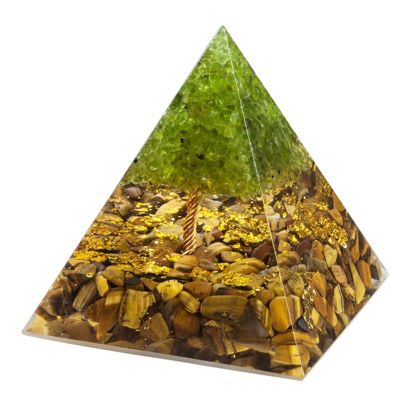 - Material: the healing stone pyramid surface is made of resin, inside there is a base of tiger's eye tumbled stone and copper shavings as well as a crystal gled tree. The crystal tree is made of peridot and copper wire handmade by craftsmen. Crystal pyramid looks very beautiful and colourful, it is like a unique landscape.