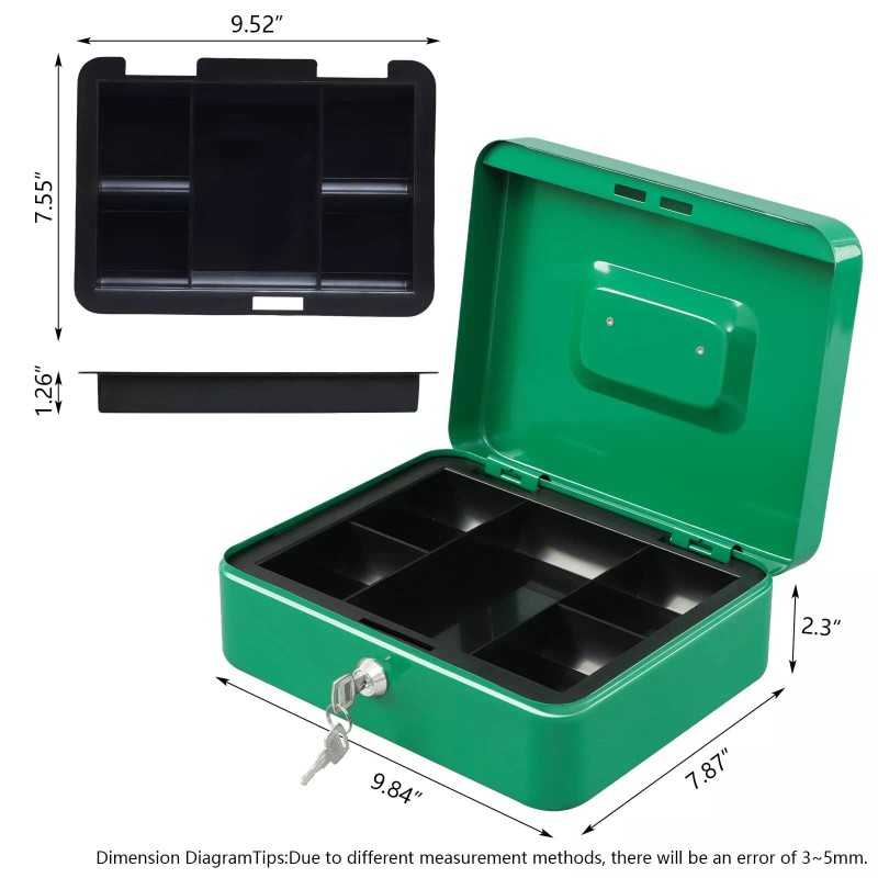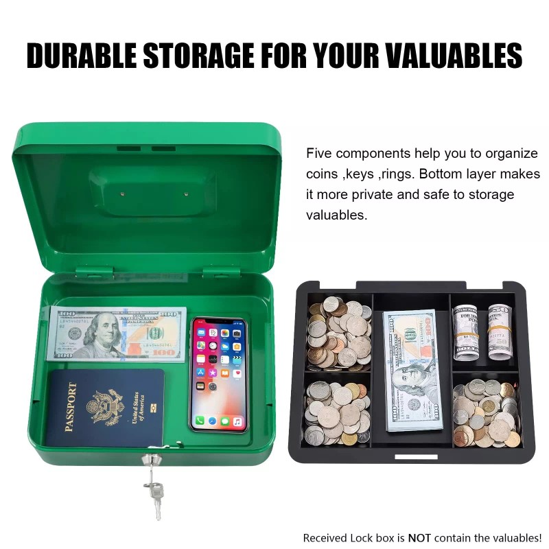 • SUFFICIENT STORAGE SPACE: Key lock box has double layers,the upper removable one with 5 compartments trays for cash,coins,and keys.The bottom one of the money box is designed for checks, receipts and valuables.