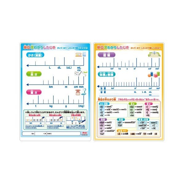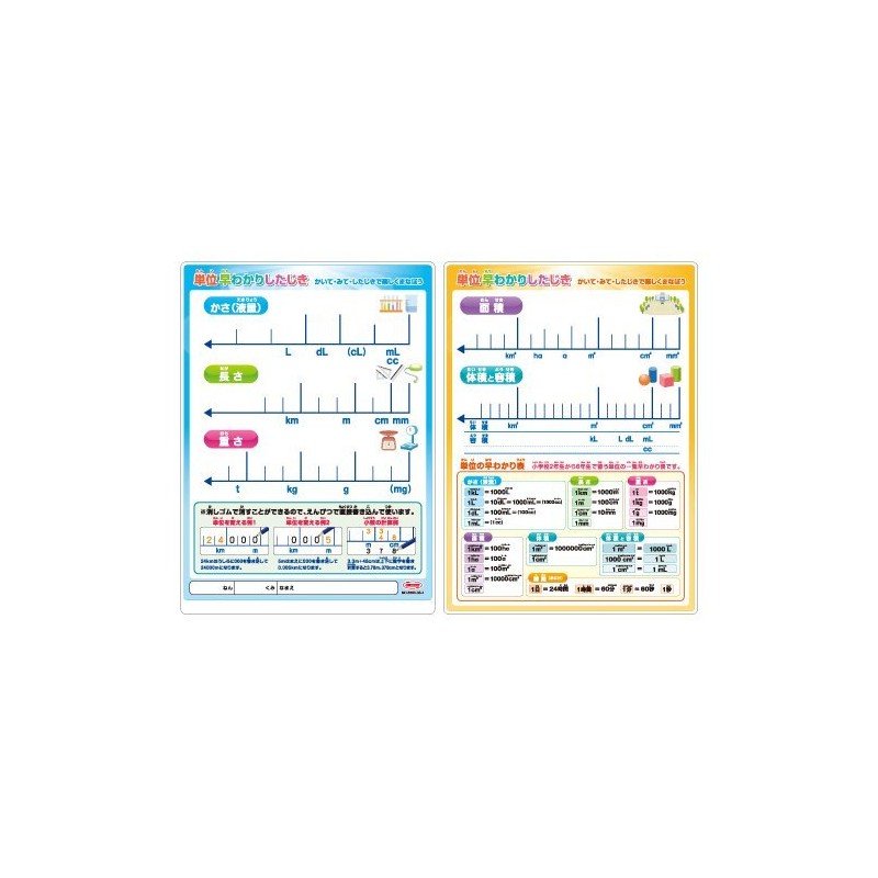 The quick learning desk pad consists of 2 sides: The outer side has unit measurements for liquid volume, length and weight, and the inner side contains unit measurements for surface area and volume.