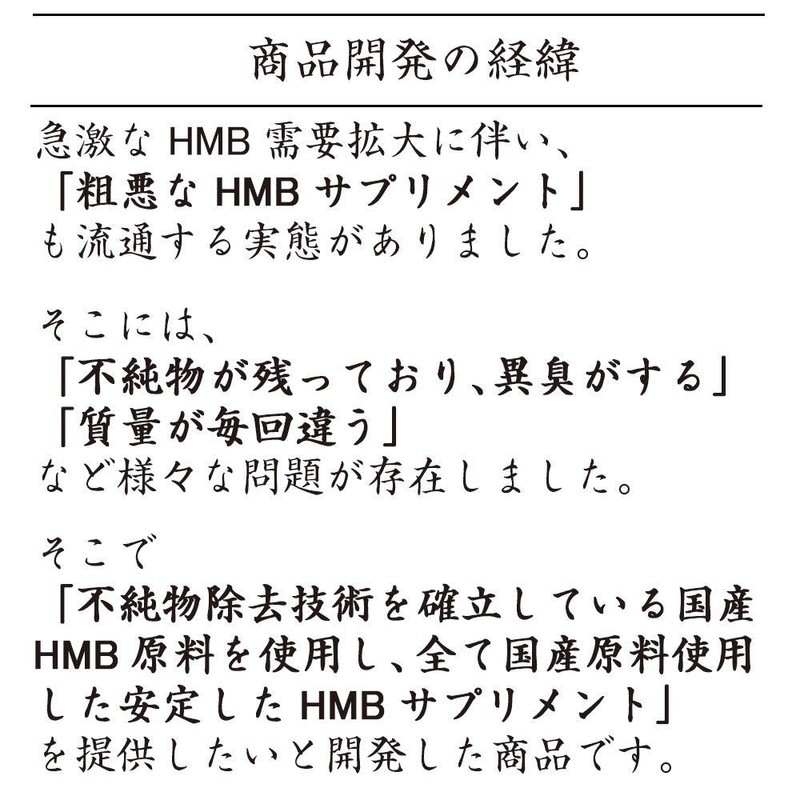 - Ingredients: HMB Calcium (Produced in Japan), Crystalline cellulose, HPC, Cellulose, Calcium stearate, Particulates, Silicon dioxide