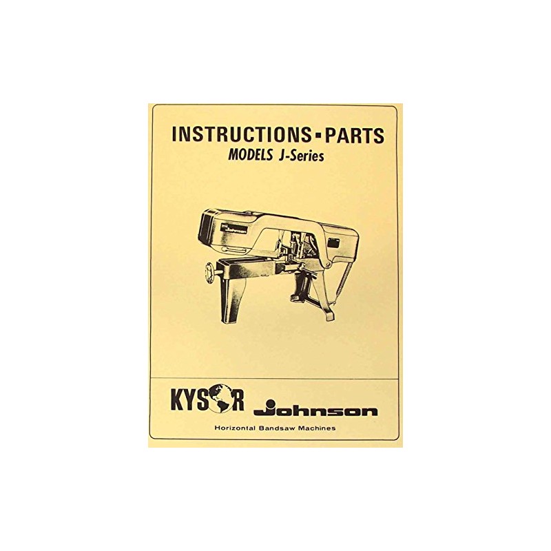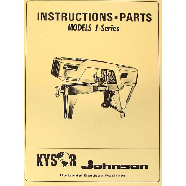 This is a reproduction, not a photocopy, of an original Kysor Johnson Horizontal Band Saw Model J-Series Instruction & Parts Manual. This manual contains information on set up, lubrication, maintenance, adjustments, and controls as well as a parts list and diagrams.