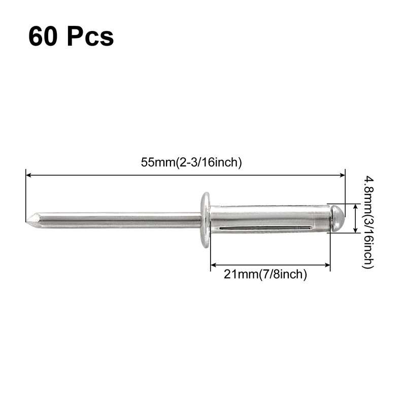 • Package & Size: The package includes 60 pcs tri-fold exploding pop rivets, abundant enough to satisfy your daily using needs. Grip Diameter: 4.8 mm (3/16"). Grip Length: 21 mm (7/8") .