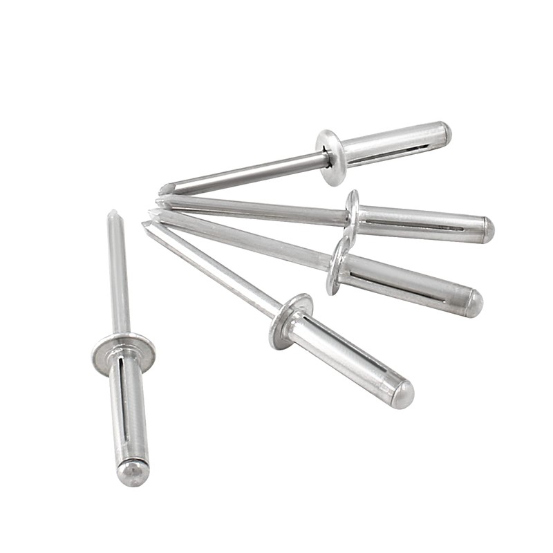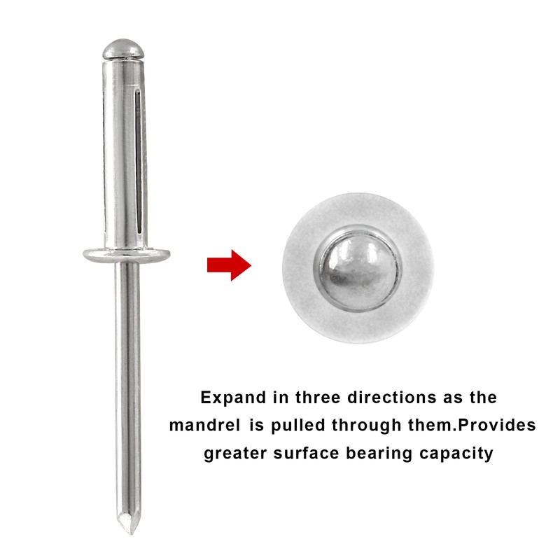 • Three-jaw Design: The exploding pop rivets is designed with three auxiliary heads, which provides greater surface bearing capacity. Compared with ordinary rivets, the tri-fold rivet increases the surface area and avoids the sag of the nail head or drilling through the riveting hole that occurs with ordinary rivets.