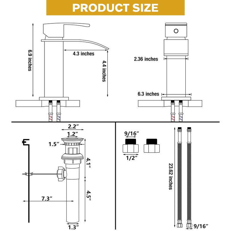 - 【Accessories Included】 Pop-Up Drain Included, 6" Deck Plate Included For 1 or 3 Holes 4-inch Center Sink Installation. 2 Flexible Hoses (Hot and Cold), and Other Parts For an Easy Installation.
