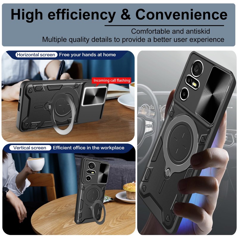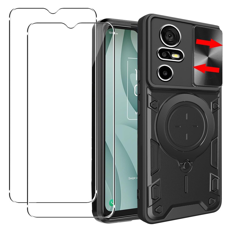 KZIOACSH Case for TCL 40 XE 5G, Military Grade Shockproof Hard PC+Soft TPU Case [Rotatable Ring Kickstand][Slide Camera Lens] Military Anti-Scratch Rugged Bumper Cover with 2 Tempered Glass, Black