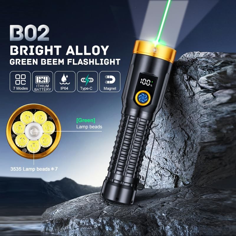 - Bright and Long Range: This flashlight has 5 main lighting modes (ultra bright, high, medium, low, strobe, etc.), making it perfect for camping, hiking, and home use. In addition, it also has 2 green light beam modes (green light beam, green light beam+low brightness), This green light flashlight delivers a bright and focused beam, visible even during the day. The bright green light allows everyone to immediately discover the place you are indicating, makes your outdoor activities safer and more enjoyable.