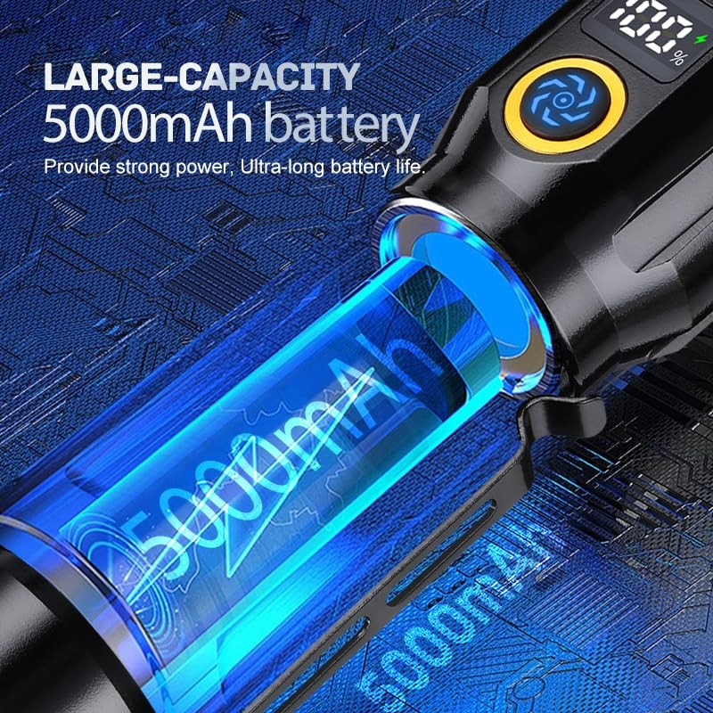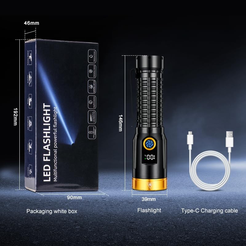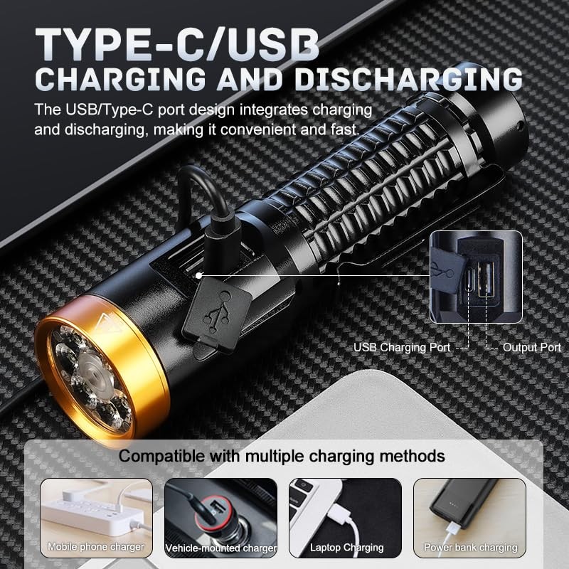 - Power Bank Function and USB-C Fast Charging: This flashlight has a built-in USB output port, which can be used as a portable power bank to charge phones and other devices, making it perfect for outdoor exploration and travel. The flashlight is equipped with a LCD power display and a USB-C fast charging port to ensure that the flashlight can be charged, so you can quickly restore it to full charge when needed.