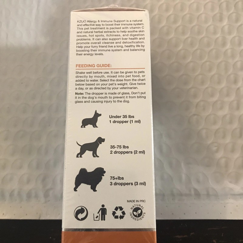 The Kzuo Allergy and Immune supplement for dogs is designed to support digestion and immune system function. This product, made in the United States, comes in a convenient drop form and is formulated with elderberry and vitamin C. Suitable for dogs of all sizes, this supplement helps promote overall health and well-being, making it a valuable addition to any pet's wellness routine.