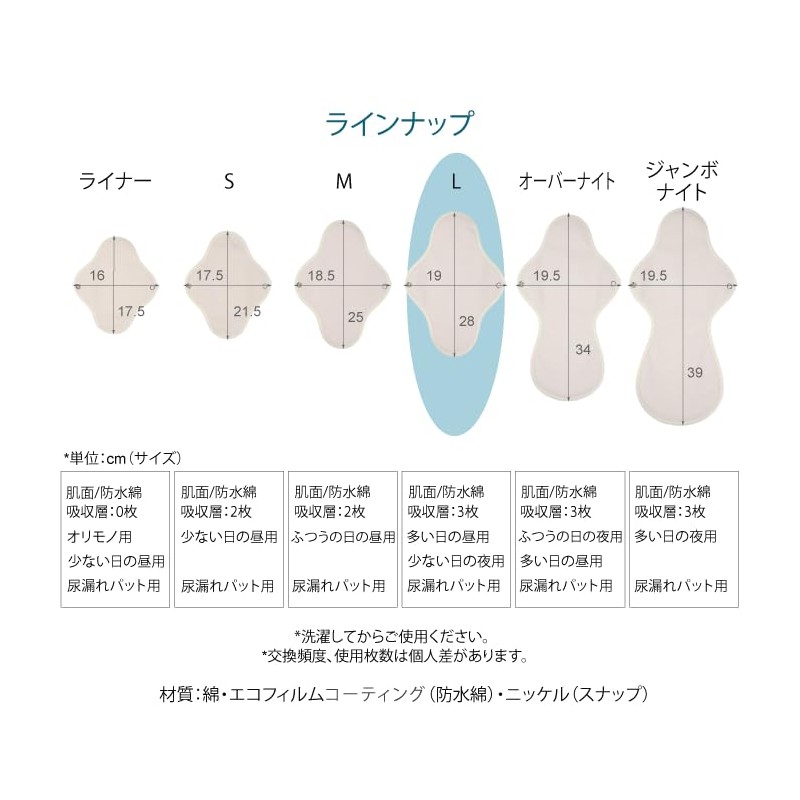 セレナプ布ナプキン ふ Lサイズ (尿漏れパット兼用) 無漂白 無染色 100%純綿 防水加工表綿 (L, 2, 枚)