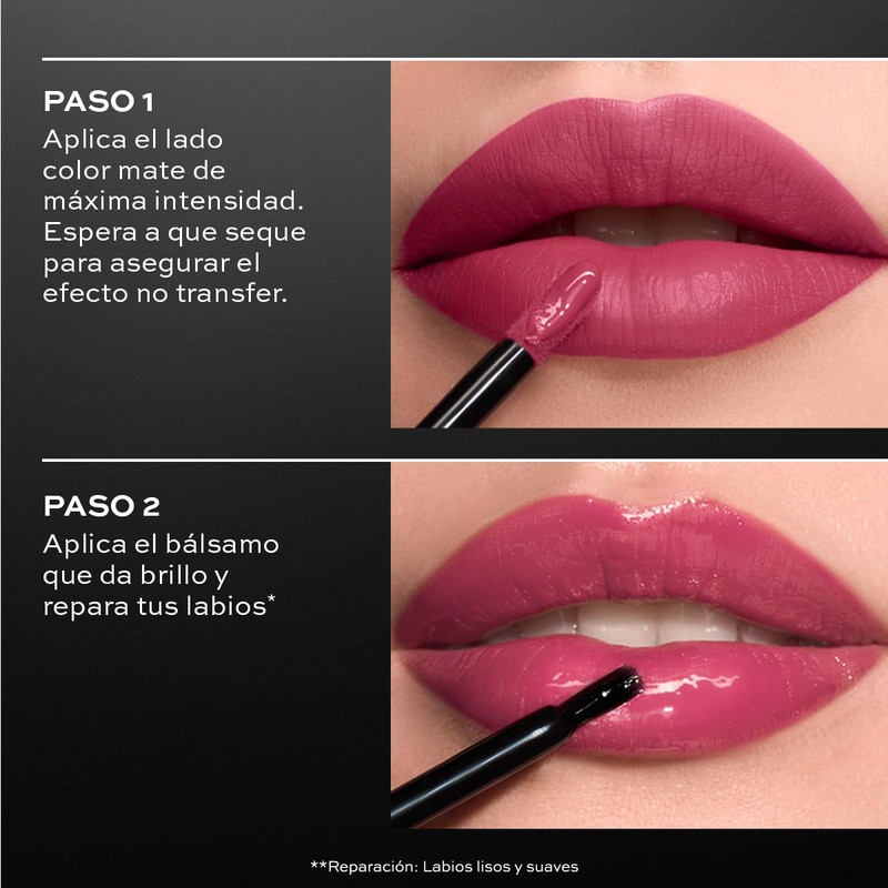 - Paso 1: Aplica el lado del labial dual color de máxima intensidad. Espera a que seque para asegurar el efecto de labial indeleble e intransferible. Paso 2: Aplica el bálsamo labial que da brillo y repara tus labios* *Reparación labios lisos y suaves.