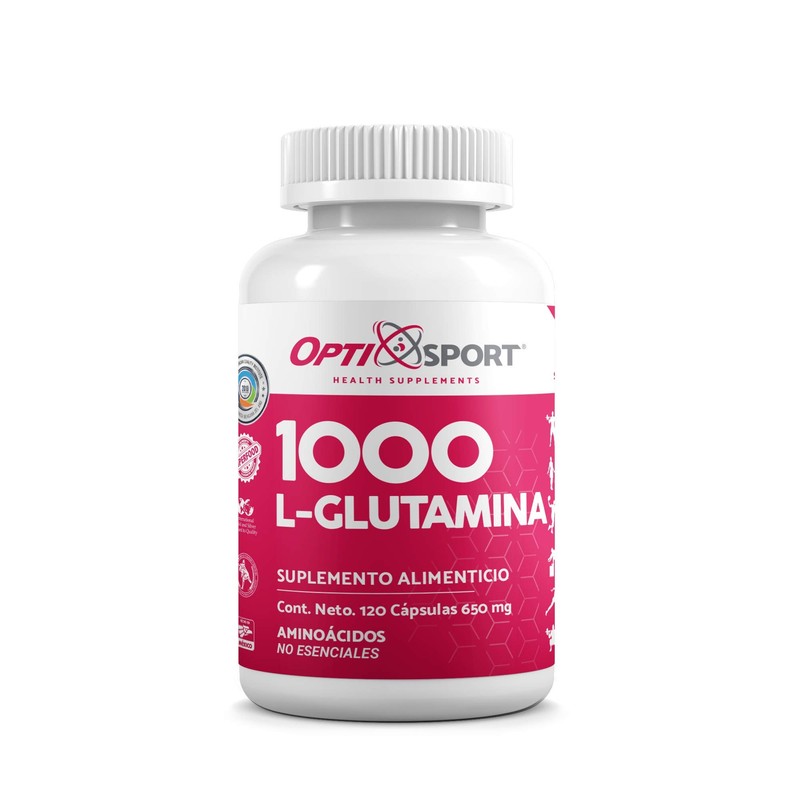 Frasco de 120 cápsulas de 650mg de L-Glutamina 1000. Este producto no es un medicamento. El consumo de este producto es responsabilidad de quién lo recomienda y de quién lo usa. No se deje al alcance de los niños. Conservese en un lugar seco y fresco.