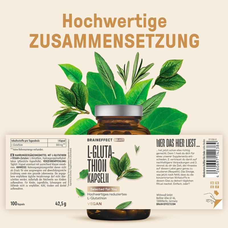 L-Glutathione, 300 mg per daily dose, 100 capsules, high dosage, pure and reduced, tripeptide: Glutamic acid, cysteine and glycine, vegan, without magnesium stearate, German quality.