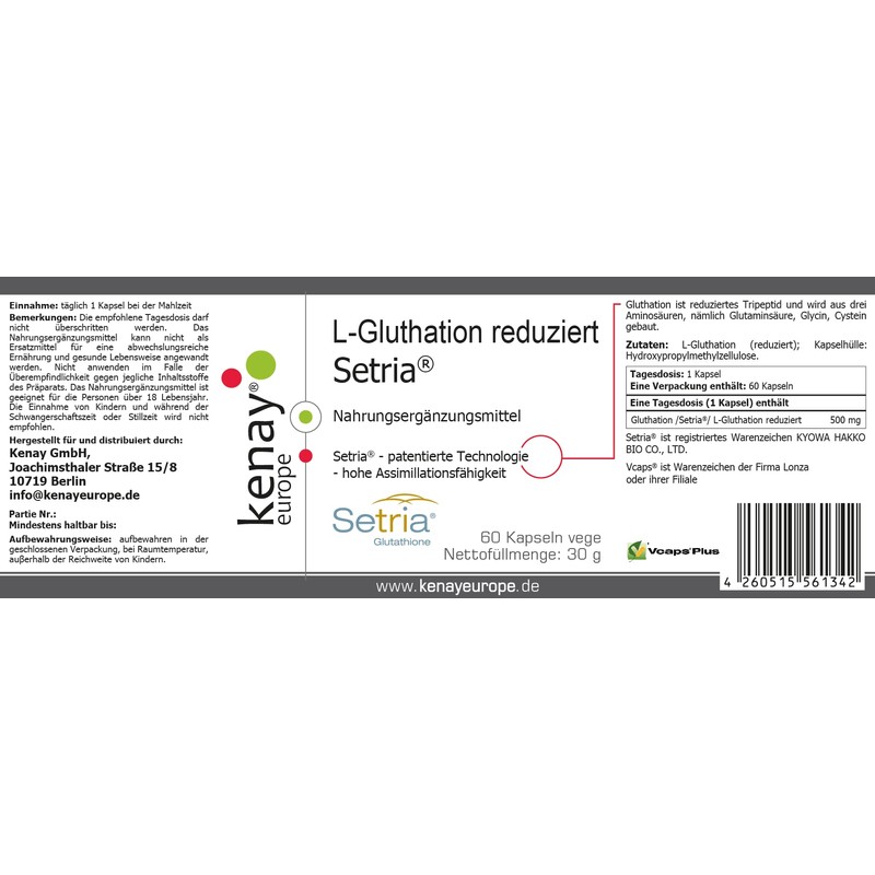 • Ingredients: L-gluthation (reduced); capsule shell: hydroxypropyl methyl cellulose.